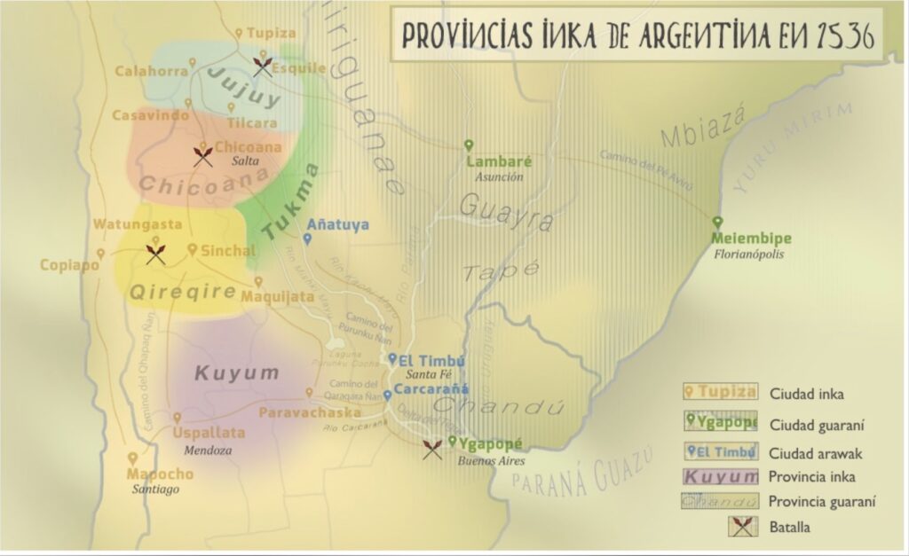 Recordemos que a orillas del Río de la Plata se localizaba el aikén o estación de aprovisionamiento más oriental de los querandí, y notemos que el ejército inka al retirarse toma el camino de los querandíes, rumbo a Chile.